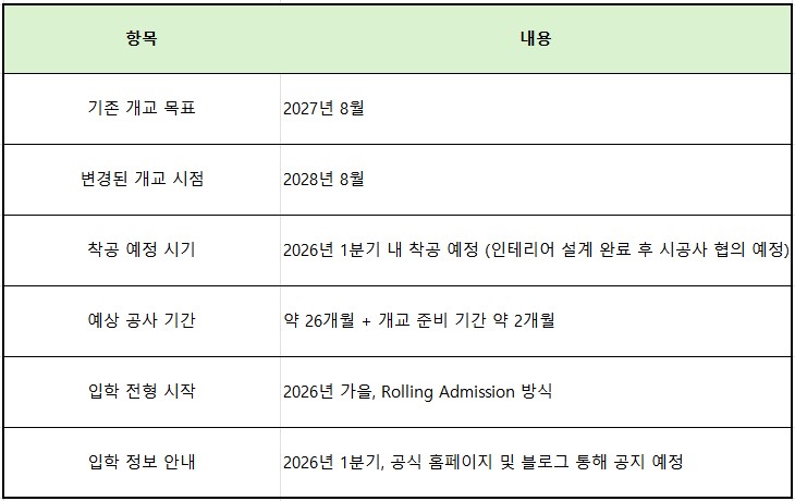 이번 개교 일정 조정은 도시계획시설 실시계획 인가 절차가 추가되며 수 개월이 지연된 데 따른 조치입니다.