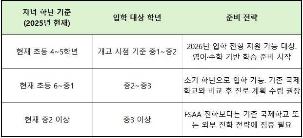 FSAA는 기존 국제학교들과 다른 방향성의 커리큘럼과 입학 정책을 선보일 가능성이 높아, KIS나 SJA와 유사한 ‘미국식 진학형 학교’와의 비교 분석이 중요합니다.